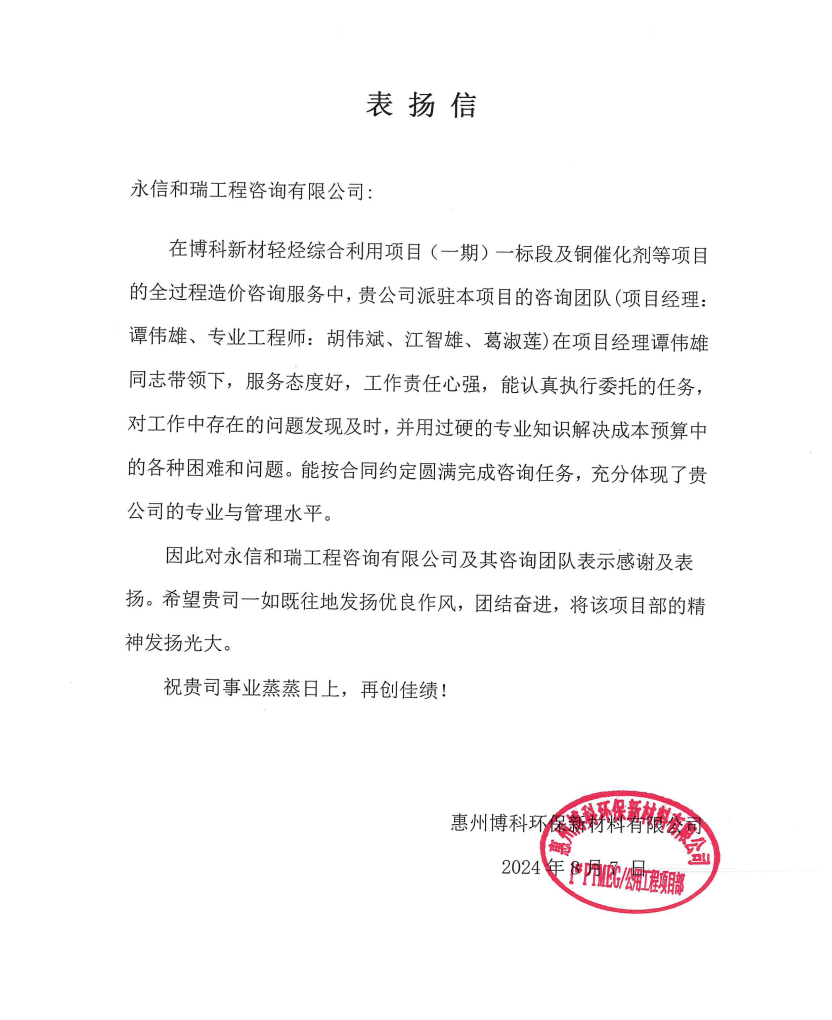 8月7日,我司派駐博科新材輕烴綜合利用項(xiàng)目(一期)一標(biāo)段及銅催化劑等項(xiàng)目進(jìn)行全過(guò)程造價(jià)咨詢服務(wù)的項(xiàng)目經(jīng)理譚偉雄,專業(yè)工程師胡偉斌、江智雄、葛淑蓮圓滿完成咨詢服務(wù),收到了來(lái)自惠州博科環(huán)保新材料有限公司的表?yè)P(yáng)信。